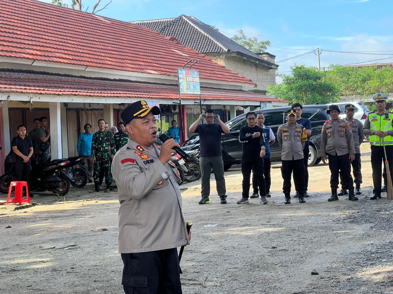 Mengawali kegiatan kurve Kapolres langsung memberikan dorongan semangat gotong royong dengan sorakan Way Kanan dan disambut teriakan Mandiri dan Sejahtera kepada peserta apel gabungan.