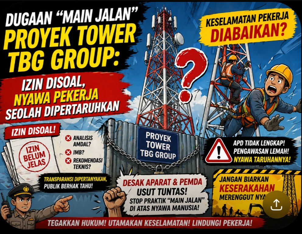 Aktivitas pembangunan tower telekomunikasi yang diduga terkait TBG Tower Bersama Group kian memantik sorotan publik. Temuan awal di lapangan bukan sekadar mengindikasikan persoalan administratif, tetapi juga membuka potensi pelanggaran serius yang menyentuh aspek keselamatan kerja—dua hal mendasar yang seharusnya tidak bisa ditawar dalam proyek berskala besar.